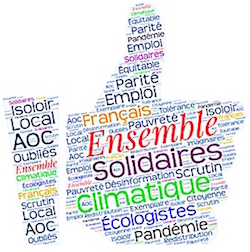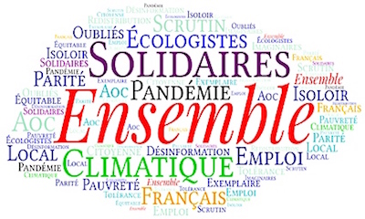 Ce n'est pas un "En ceci nous croyons" classique, que nous prêtons aux candidats, mais plutôt un inventaire comme si les candidats de la liste "Ensemble, Français écologistes et solidaires" s'était réunis autour d'une série de mots-clé. On peut s'en tenir à l'inventaire présenté sous forme d'images statiques plus bas. Si vous voulez aller plus loin, cliquez sur les mots colorés de l'inventaire dynamique qui suit; votre geste sera récompensé par un commentaire. Cliquez sur la bulle pour la refermer. Garanti 100% sans promesse électorale.1. Inventaire cliquable